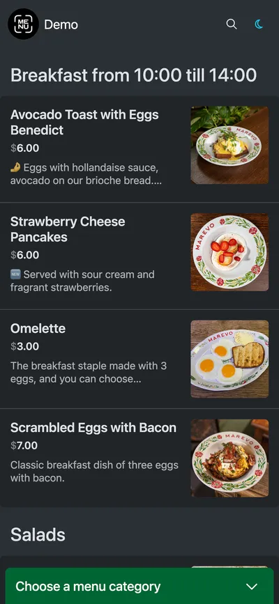 You can customize which menu items to display or hide on your website. Arrange items, categories, and subcategories, and promote key dishes by featuring them at the top.