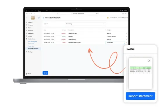 Forget manual payment tracking. Upload a statement from any bank—our AI-powered assistant will recognize every transaction and add them as Transactions in Poster.