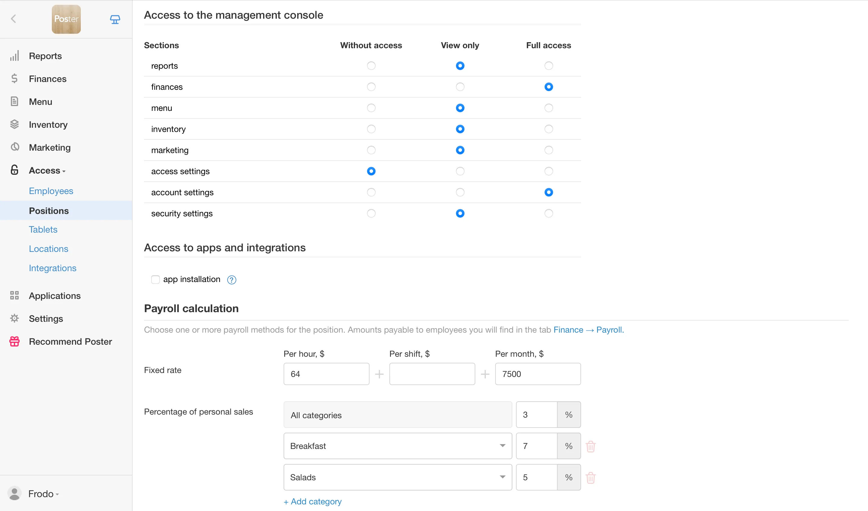 Set up time tracking and specify the hourly, shift, or monthly rates. Indicate categories for which employees will earn commissions. Choose one or multiple methods of calculating payroll based on the employee’s position.