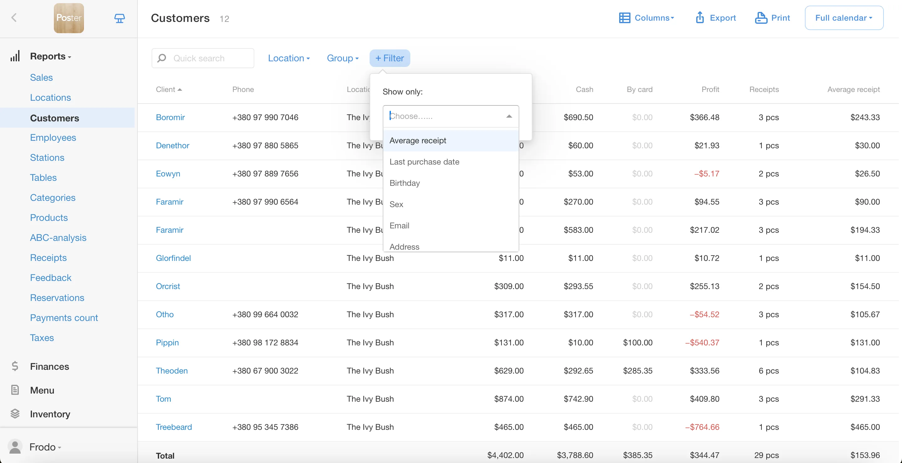 Be aware of your customers’ favorite food and their average check, view their contacts, receipts, discounts, bonuses and more. You will have full information on every customer.