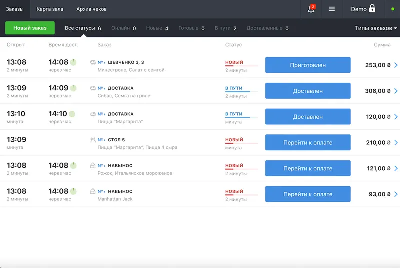 Вы всегда видите актуальный статус каждого заказа. Poster напомнит, когда начинать готовить заказ или когда передать его курьеру для доставки.