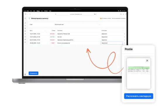 Без лишних настроек. Сфотографируйте документ или загрузите выписку из банка — Postie AI сделает остальное: распознает текст, добавит товары, количество, суммы и транзакции.
