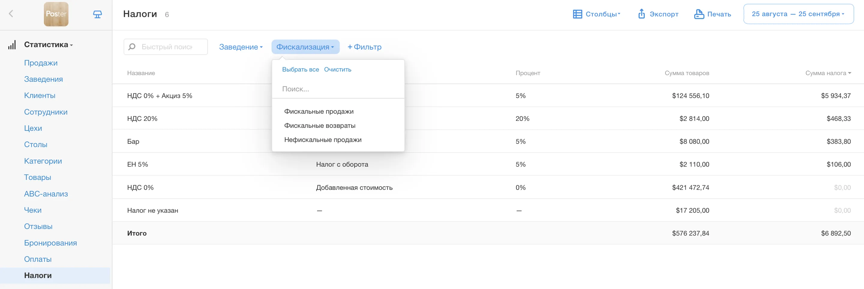 Настройте налоги в Poster и тратьте минимум времени в конце квартала на отчётность. Poster посчитает фискальную выручку и сумму НДС к уплате отдельно от других операций.