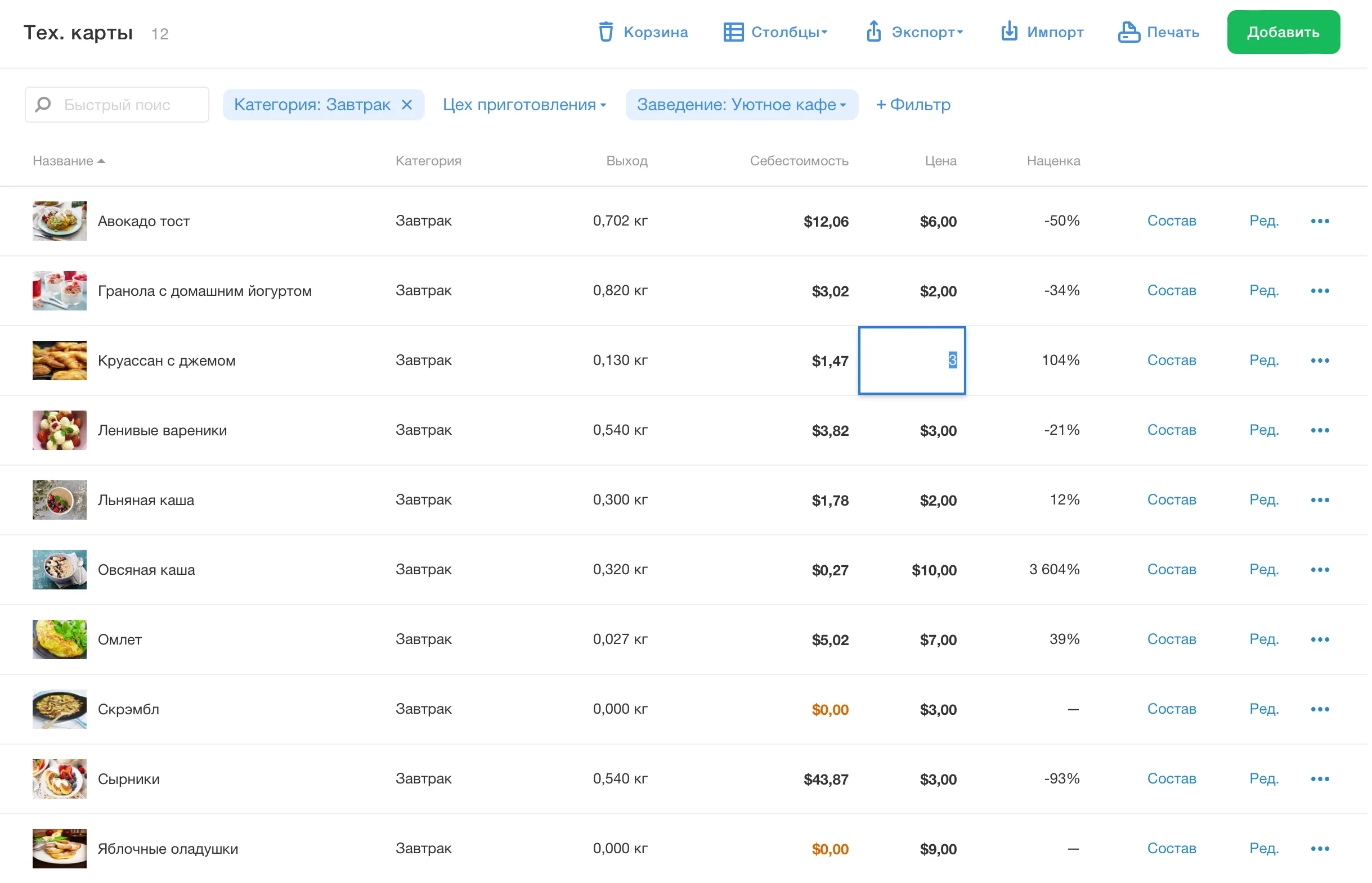 Посмотреть текущую себестоимость моих ингредиентов, блюд и полуфабрикатов?