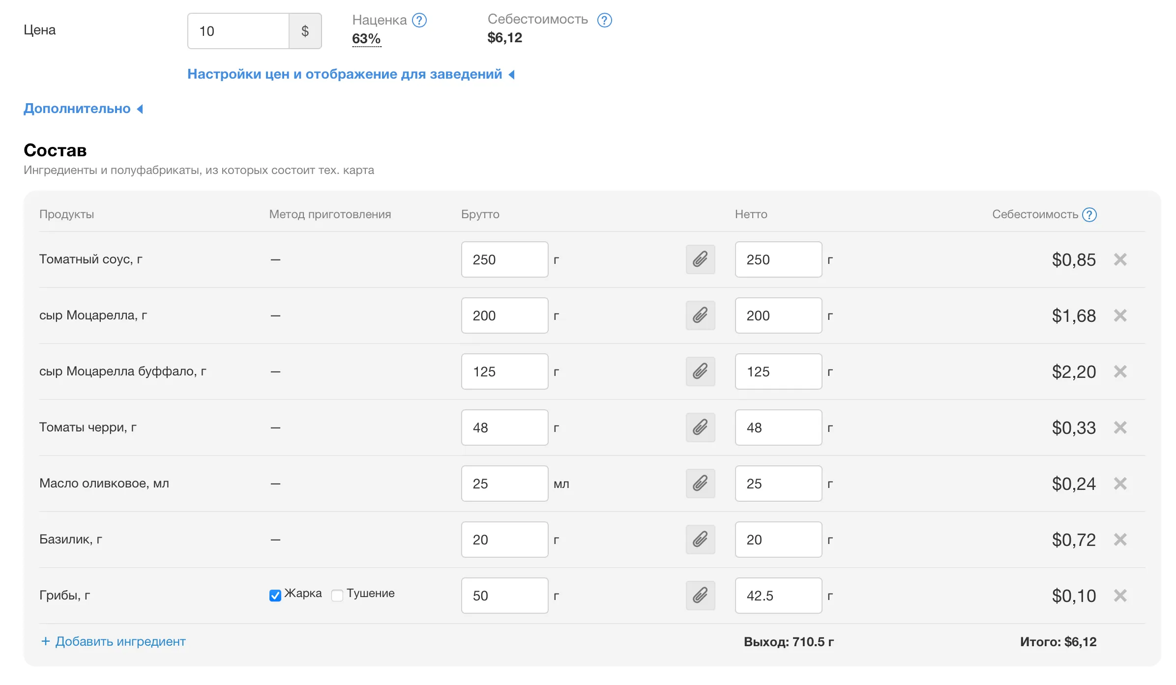 Для стейков, гриля или тортов, которые продаются на вес, укажите цену за 100 г. Во время продажи официант будет вводить на кассе только вес, а стоимость пересчитается автоматически.
