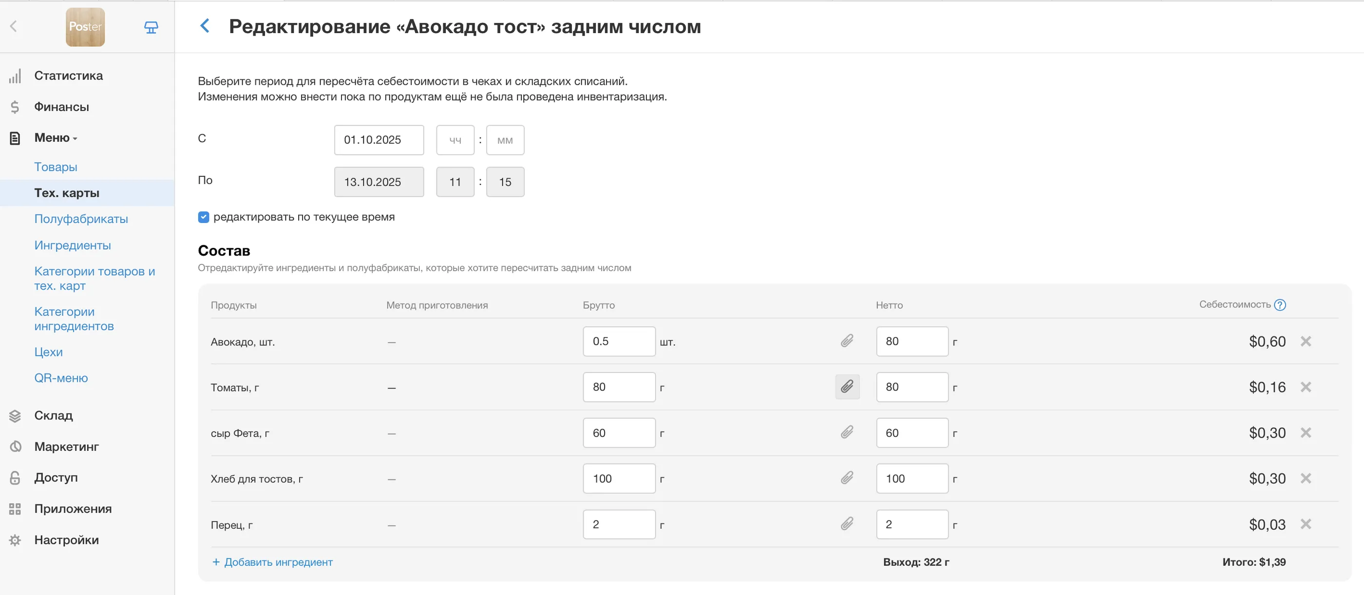Себестоимость тех. карт рассчитывается автоматически с учетом поставок ингредиентов и остатков на складе. Себестоимость будет пересчитываться после каждой новой поставки.