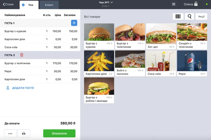 - зручне переключення між офіціантами