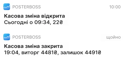 Отримуйте повідомлення на ваш смартфон, одразу після завершення касової зміни, щоб першим знати, який прибуток приніс ваш бізнес.
