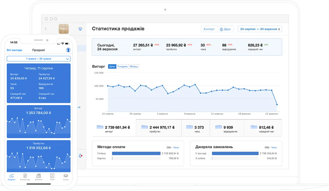 Ви дізнаєтеся, які позиції продаються частіше і який заклад приносить більше прибутку, хто з працівників ефективніший та які способи оплати обирають клієнти.