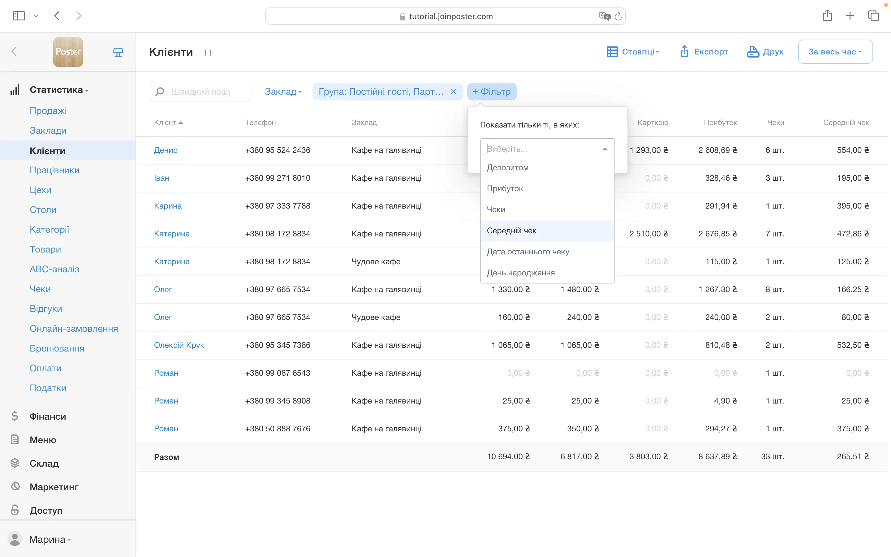 Дізнайтеся, які у клієнта улюблені страви, який середній чек, подивіться контакти, всі замовлення, знижки, бонуси та багато іншого. У вас буде повна інформація щодо кожного гостя.
