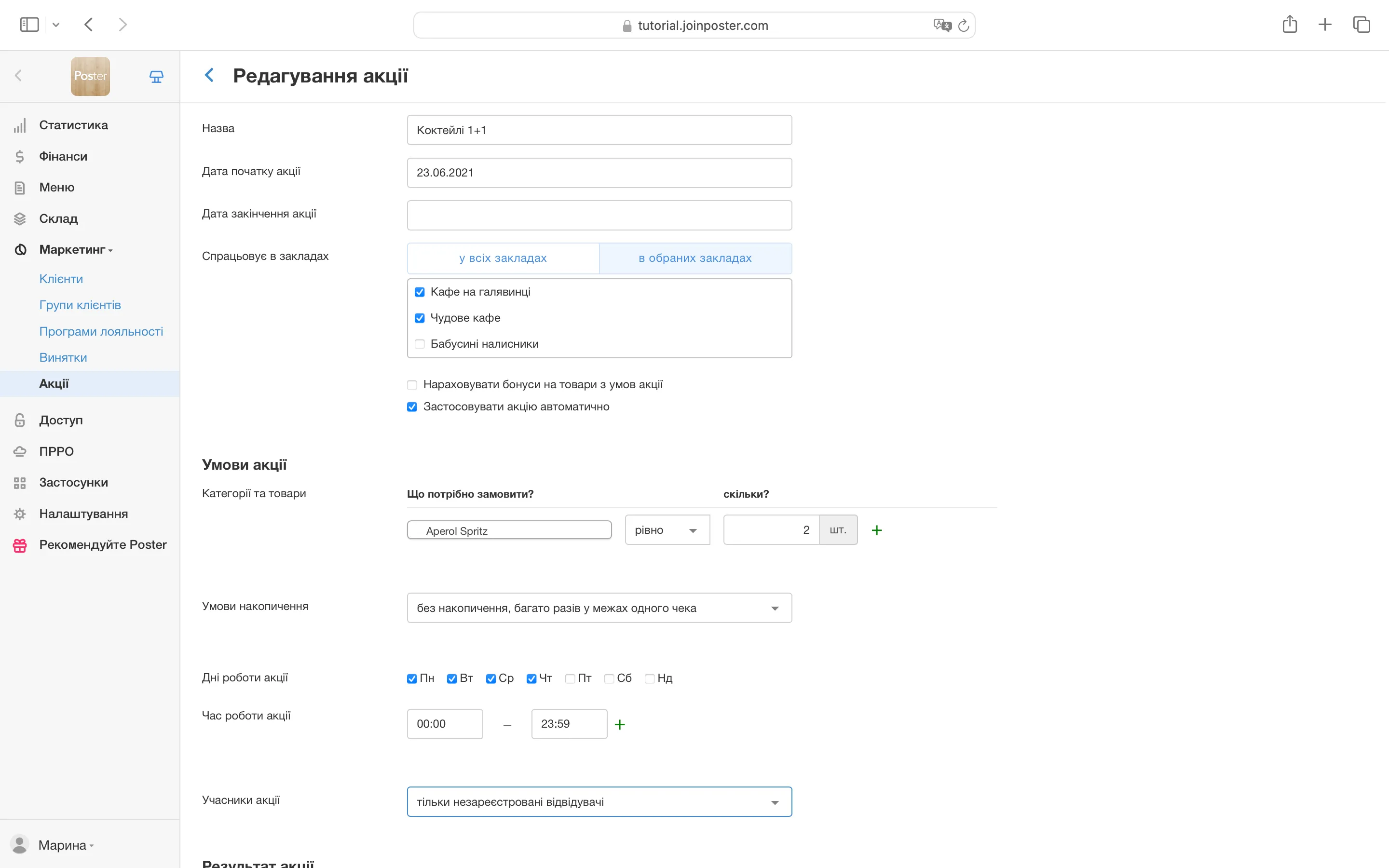 Ми зробили гнучкий конструктор акцій, щоб ви створювати будь-які спеціальні пропозиції та акції. Наприклад, пропонуйте гостям знижку на нерозпродану випічку після шостої, спеціальні ціни на меню в будні в обідні години, акції «2+1» та «Шоста кава в подарунок».